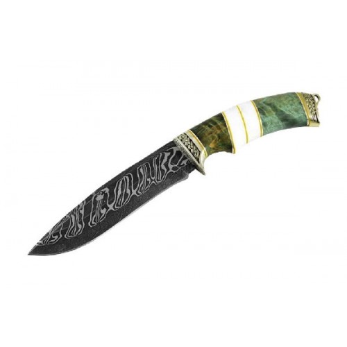 Нож «Скиф» весьма напоминает скифский меч акинак, однако меньшая длина лезвия не дает права отнести его к холодному оружию. Лезвие изготовлено из дамасской стали и превосходит другие клинки по своим качественным характеристикам. Прочный, стойкий к ударам и гибкий, устойчивый к коррозии клинок, имеющий при этом строгий без излишеств декор - не так уж часто встречающийся оптимальный набор характеристик. Рукоять выполнена из стабилизированной карельской березы, мельхиора и композита, которая отличается повышенной устойчивостью к влаге. Стабилизированная древесина сохраняет внешний вид в процессе интенсивной эксплуатации, не выгорает, не выцветает, не взаимодействует с техническими маслами и активными химическими растворителями и даже выдерживает воздействие открытого огня. Этот оригинальный нож с гардой и тыльником, украшенными мельхиоровым литьем с узорами, станет приятным в эксплуатации, незаменимым и крайне удобным походным инструментом.