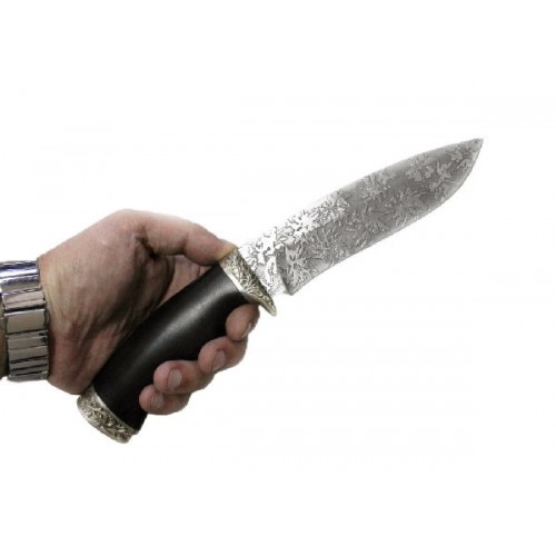Серия ножей «Скиф» имеет универсальное назначение. Такие ножи позволяют выполнять работы, требующие прочности, гибкости и устойчивости режущего инструмента к разноплановым нагрузкам. Скругленный, выгнутый обух лезвия и режущей кромки делают его похожим на скандинавские ножи, используемые для большинства повседневных работ. Кроме того, это не позволяет отнести данную модель ножа к категории оружия. Рукоять оформлена ценными породами древесины и оснащена гардой с ограничителем и тыльником из мельхиорового узорного литья.
