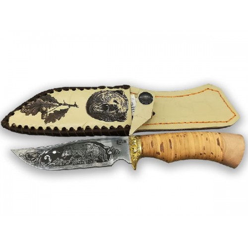 "Юнкер" - сочетание практичности и красоты. Кованый клинок долго держит заточку даже при частом использовании. Рукоять из бересты необычайно рациональна: этот природный материал не гниет, не холодит руку зимой. А филигранная гравировка придает ножу благородный вид.