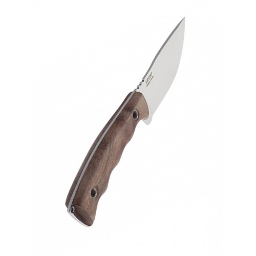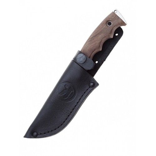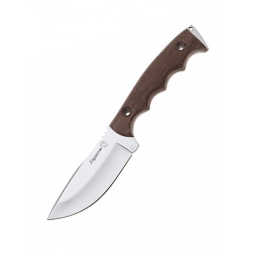 Нож с коротким и широким клинком для выполнения ежедневных хозяйственно бытовых задач. Нож Караколь имеет прямое лезвие с небольшим фальшлезвием на обухе и нижней кромкой, которая возвышается к острию. Нож отлично приспособлен для свежевания и разделывания добычи. Такой вариант понравится тем, кто не любит длинные ножи, которые на подвесе часто цепляются за кусты и ветки при хождении по лесу. Клинок выполнен из прочной стали устойчивой к коррозии и закаленной до 55-57 HRC. Хвостовик клинка насквозь проходит рукоять и образует на конце ножа ударный выступ с темлячным отверстием. Рукоять ножа выполнена из кавказского ореха. Тип монтажа – накладной с применением полых развальцованных штифтов.
