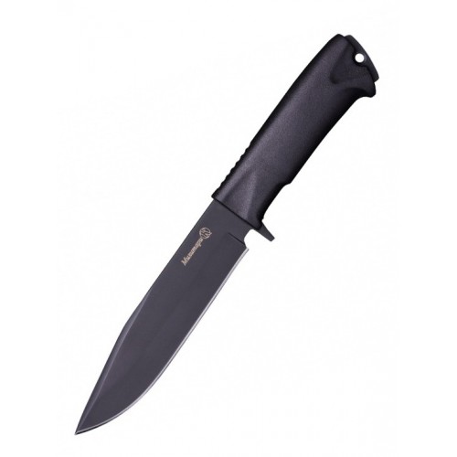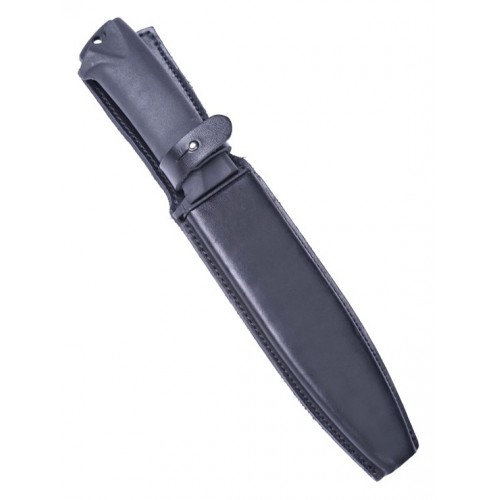 Нож Милитари станет отличным помощником всем тем, чья работа связана с возможностью оказаться в экстремальной ситуации. Клинок имеет форму с небольшим понижением обуха по направлению к кончику. От середины обуха начинается фальшлезвие. Клинок имеет общее сужение по направлению к кончику и высокие спуски от середины. Клинок сплошной, проходит через всю рукоять. В заднике ножа, клинок выступает, образуя ударное навершие с темлячным отверстием. Благодаря особой форме клинка, нож отлично приспособлен для совершения колющих и режущих движений. Упор второй руки на окончание рукояти, обеспечивает максимальное усилие на кончике ножа. Клинок имеет черное матовое покрытие, благодаря чему не бликует на солнце. Рукоятка ножа выполнена из эластрона и имеет эргономичную форму. Рукоять имеет небольшие ограничители для безопасного удержания ножа и защиты руки от соскальзывания в процессе работы. Нож укомплектован ножнами из качественной кожи.