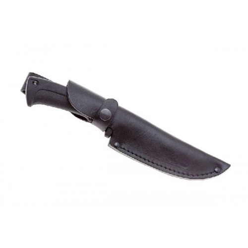 Клинок из нержавеющей стали имеет матовое защитное покрытие и острые зубцы на обухе. Литая рукоять из эластрона удобна для работы любым хватом. Нож дополняет качественный кожаный чехол для ношения на поясе.