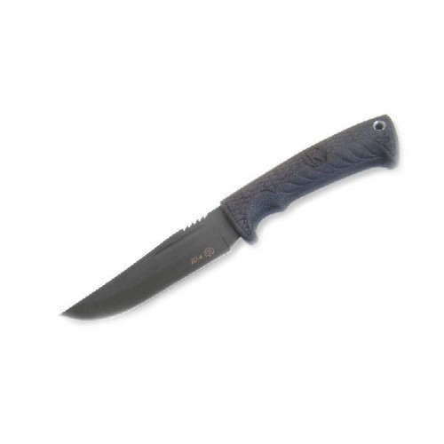 Форма клинка прямая, со слегка вогнутым скосом обуха. Часть обуха имеет острую пилообразную заточку, которая используется для чистки рыбы и разрезания синтетических шнуров. Острый кончик позволяет делать отверстия в различных материалах. Клинок изготовлен из популярной нержавеющей стали 65Х13, которая придает ножу высокую прочность и отличные режущие свойства в сочетании со способностью легко затачиваться.
