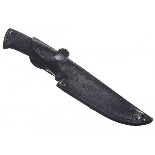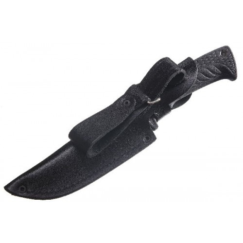 Клинок из нержавеющей стали имеет острые зубцы на обухе. Литая рукоять из эластрона удобна для работы любым хватом. Нож дополняет качественный кожаный чехол для ношения на поясе.