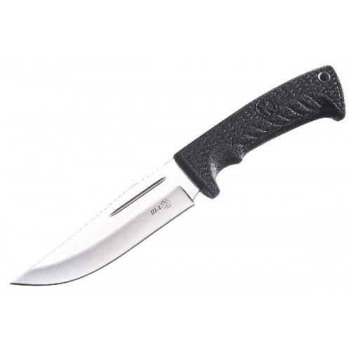 Форма клинка прямая, со слегка вогнутым скосом обуха. Часть обуха имеет острую пилообразную заточку, которая используется для чистки рыбы и разрезания синтетических шнуров. Острый кончик позволяет делать отверстия в различных материалах. Клинок изготовлен из популярной нержавеющей стали 65Х13, которая придает ножу высокую прочность и отличные режущие свойства в сочетании со способностью легко затачиваться.