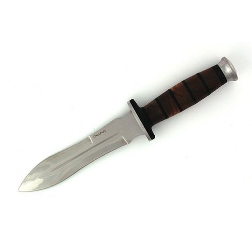 Хвостовик проходит насквозь через рукоять, образуя на конце выступ-стеклобой. Рукоять выполнена из эластрона и оснащена цепкими насечками для лучшего хвата. Нож оснащен обрезиненной гардой.