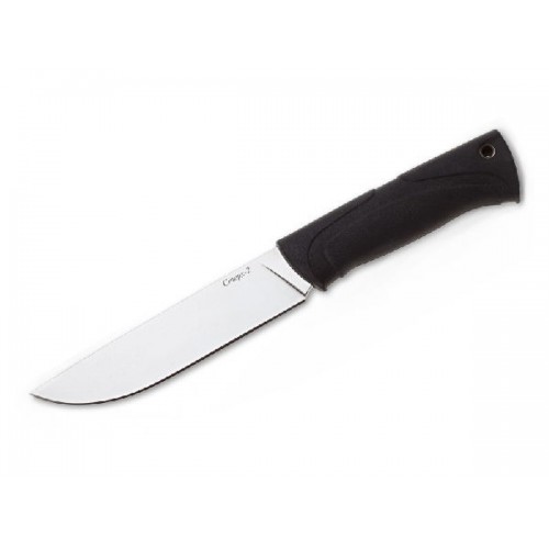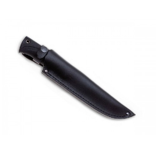Модель ножа из серии «Стерх» характеризуется общей плавностью линий, универсальностью формы клинка, прекрасными режущими свойствами. Для рукояти использован мягкий и нескользящий резинопластик Elastron G. Комплектуется кожаными ножнами погружного типа.