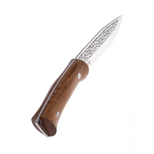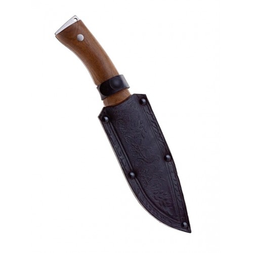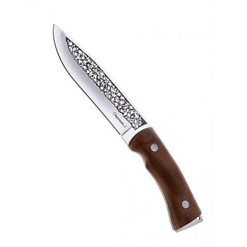 Модель «Стрепет-2» - классический охотничий нож с клинком среднего размера, украшенным стилизованным орнаментом. Эргономичная рукоять выполнена из древесины кавказского ореха. В комплекте с ножом идут кожаные ножны.