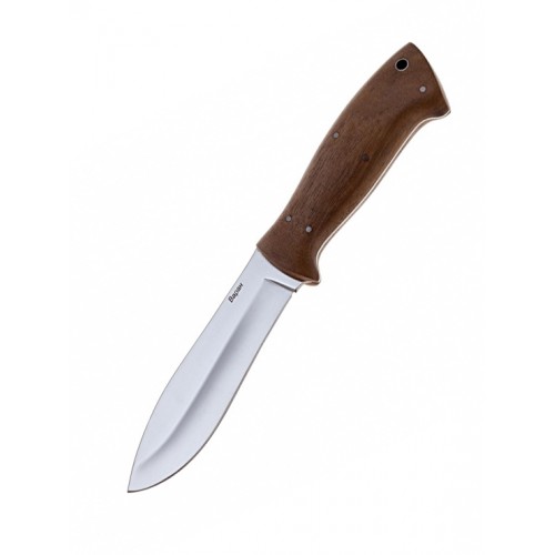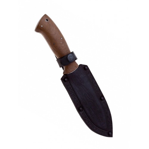Нож “Варан” имеет накладной монтаж рукояти и полный хвостовик, поэтому он очень прочен и подходит для силовых работ. Рукоять сформирована накладками из древесины кавказского ореха. Плашки надежно закреплены на хвостовике с помощью штифтов в пяти местах. В верхней части головки рукояти имеется отверстие для крепления темляка.
