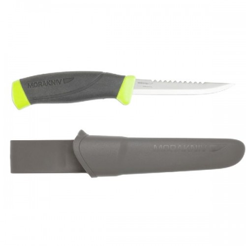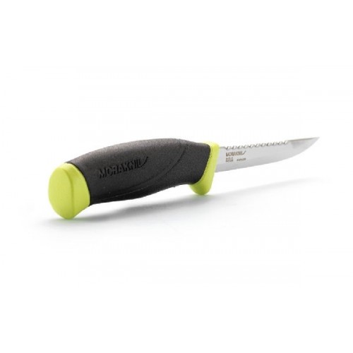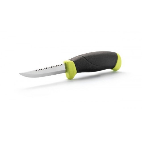 Эргономичная форма рукоятки, за основу которой взята рукоять серии Companion, помогает надежно удерживать нож в руке при выполнении работ. Для изготовления рукояти использован прорезиненный черный пластик со вставками салатового цвета, которые являются визитной карточкой всей серии Fishing Comfort. Для безопасности и удобства при транспортировке, нож комплектуется пластиковыми ножнами черного цвета, в которых он надежно фиксируется, а при желании, может быть размещен на поясе, благодаря наличию зажима на ножнах.