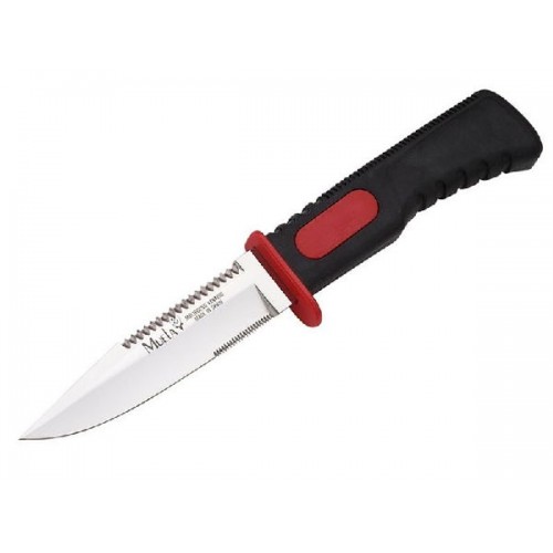 Нож ныряльщика Muela. Острие клинка отсутствует, на его месте выполнена рабочая часть инструмента (скребка) шириной 6±1 мм. Пластиковый чехол/ножны с фиксатором и резиновым ремнём с креплением на ногу. Рукоять - пластик с резиновыми вставками красного цвета. Клинок ножа длиной 110 мм прекрасно отполирован, что является дополнительной защитой от воздействия водной среды, особенно морской (из-за высокого содержания соли). Изготовлен клинок из той же нержавеющей легированной стали, что и клинки лучших ножей Muela. Ножи сертифицированы и соответствуют ГОСТ Р 51501-99 "Ножи туристические и специальные спортивные".