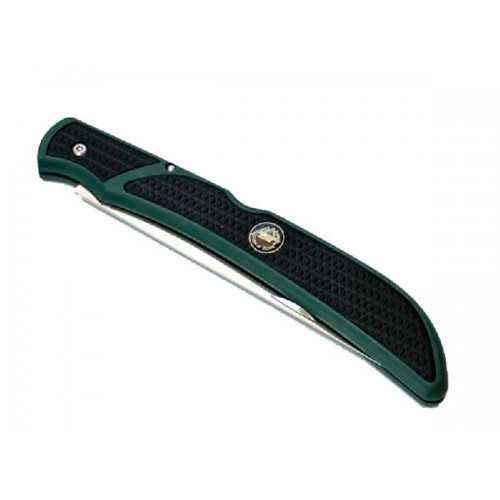 Складной филейный нож, предназначенный для охоты и рыбалки (для крупной дичи и рыбы соответственно), крепкий, практичный. Лезвие гибкое и прочное. Материал рукояти – пластик с резиновыми вставками черно-зеленого цвета. Лезвие фиксируется в открытом положении, что предотвращает его случайное закрытие и служит безопасности пользователя. Клипса для ношения на поясе и в кармане.