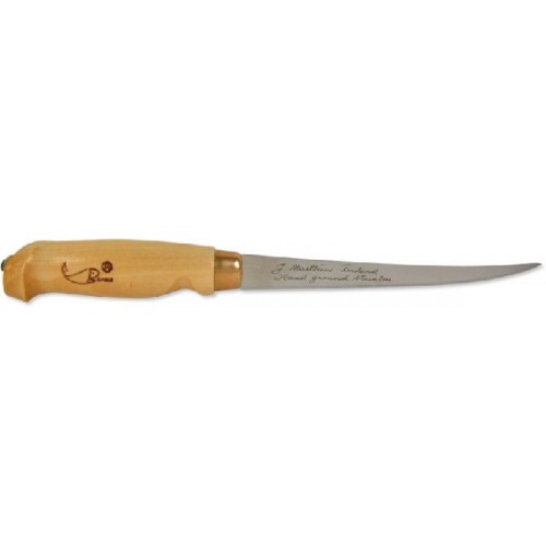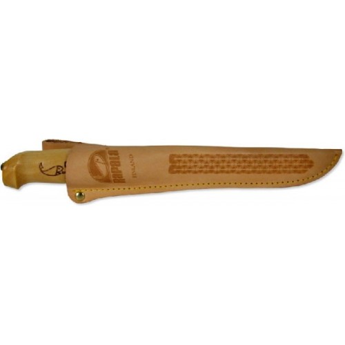 В процессе производства филейного ножа Rapala FNF7 производитель чрезвычайно ответственно подошел к изготовлению каждой части изделия. Как результат в общем модель получилась очень удобной, качественной и надежной. Хорошо заточенный вручную клинок равномерно сужается, образуя изящный изогнутый профиль ножа. Хвостовик клинка полностью входит в рукоятку, обеспечивая надежное его крепление. Выбор материала для ручки производитель остановил на березовой лакированной древесине. Она не только стильно выглядит, но и долговечна и надежна в использовании. Чтобы всегда поддерживать состояние лезвия в заточенном состоянии, в комплектацию входит удобное точило. А для защиты от загрязнений и обеспечения безопасности во время переноски есть красивый тесненный кожаный чехол.