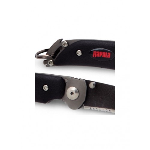 Нож Rapala складной клинок 7,5 см рукоять пластик с зубчатым лезвием у основания, изготовлен из нержавеющей стали с покрытием PTFE. Прекрасно подходит, как для рыбаков, так и для туристов. Включает в себя инструмент для настройки наживки, резак для лески, ножны и шнур. Удобная эргономичная рукоять выполнена из термопластика.
