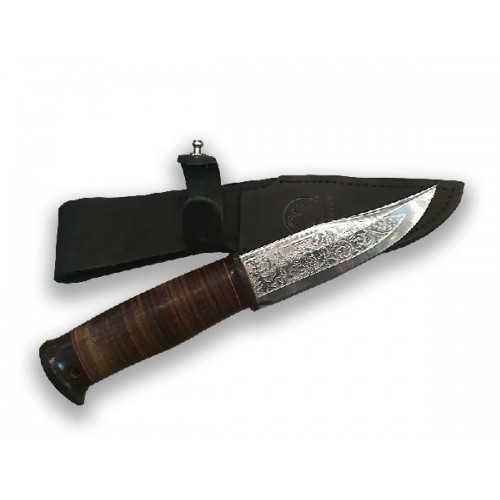 Нож изготовлен из Златоустовской стали марок 40Х10С2М (Э И-107), 95Х18, композиционного высоко- или низколегированного дамаска (в зависимости от модели) \и комплектуется ножнами из натуральной кожи.
