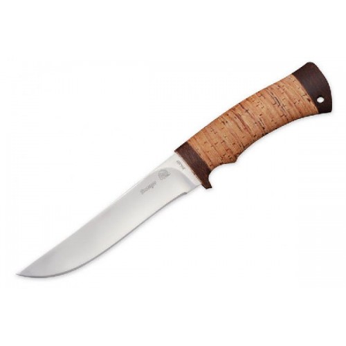 "Монблан" - классический походный нож. Пятнадцатисантиметровый прямой клинок удобен в работе. Не менее удобная рукоять снабжена упором для надежного удержания в руке. Рукоять сделана из текстолита и декорирована натуральной наборной берестой. На обухе предусмотрено отверстие под темляк.
