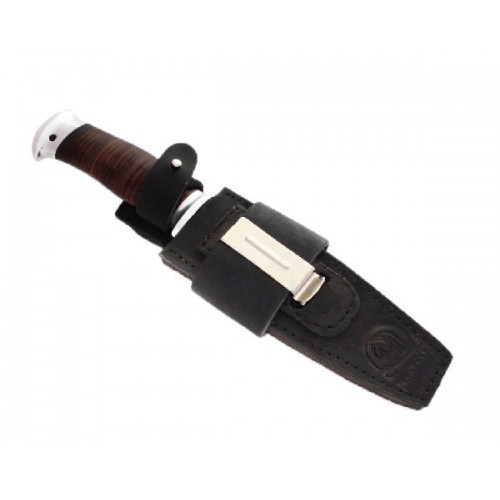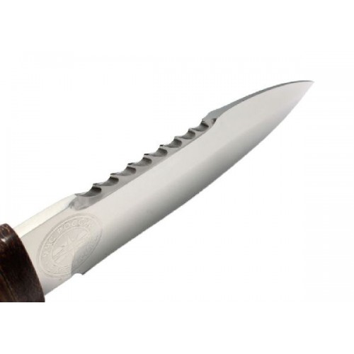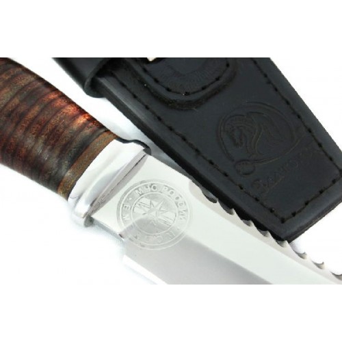 Нож Спас-1 – это универсальный нож, подходящий для любых целей. Он был разработан А. Николаевым для использования при спасательных операциях и походах высшей категории. Он предусматривает довольно грубое обращение, ввиду специфики, поэтому вы можете не бояться брать его даже в самые сложные условия. Обух ножа имеет имитацию заточки, образуя лезвием острый угол, который хорошо подойдет для тонких работ. Спас-1 прекрасно справляется как с уколами, так и с резами. Клинок ножа изготовлен из специализированной стали 40X10C2M. Это самая популярная сталь для изготовления ножей, так как давно себя зарекомендовала как прочный материал, долго держащий заточку. Рукоять выполнена из кожи, которая является отличным прочным материалом. Она мягкая, комфортно ложится в руку и не скользит. Ухватистость остается очень высокой, если рука мокрая и, даже окровавленная. Вы можете не бояться, что нож выскользнет в самый неподходящий момент, и смело пользоваться им в любых погодных условиях.