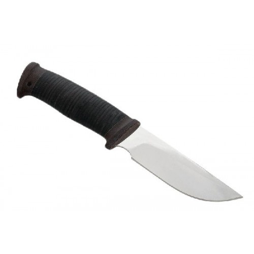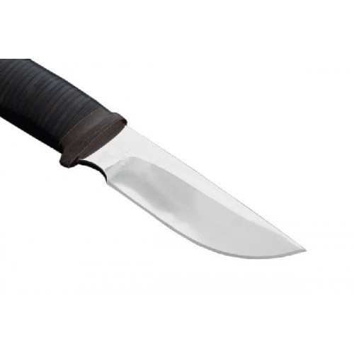Нож Сталкер – это удобный, функциональный и красивый нож с широким клинком. Вогнутая срезка клинка образует тонкое лезвие, благодаря которому, он приобретает отличные режущие качества. Форма клинка, схожая со скандинавским скиннером, великолепно снимает шкуру с животного, не повреждая при этом брюшину. А сталь ЭИ-107, из которой изготовлен нож, долго держит заточку и устойчива к внешним воздействиям. Эргономичная рукоять удобно лежит в руке, обеспечивая комфортную работу с упором указательного пальца в обух клинка. Это позволяет делать точные надрезы и работать с ножом на протяжении долгого времени, не боясь, что рука быстро устанет. Рукоять выполнена из кожи. Это довольно старый способ оформления рукоятей, использовавшийся еще со времен Древнего Рима и, до сегодняшнего дня не потерявший актуальности. Кожаная рукоять приятно лежит в руке, не скользит и не холодит руку даже в самые лютые морозы. Кроме того, она имеет приятный внешний вид и как нельзя лучше сочетается с полированной сталью клинка.