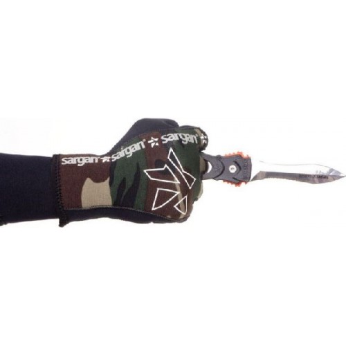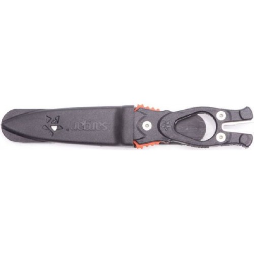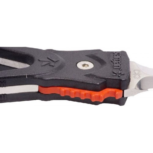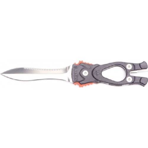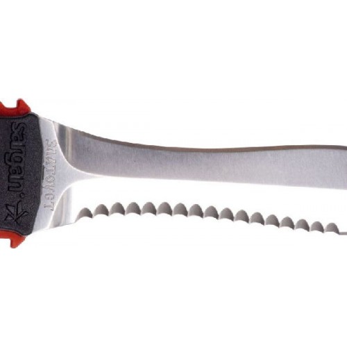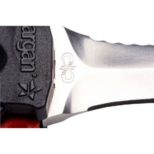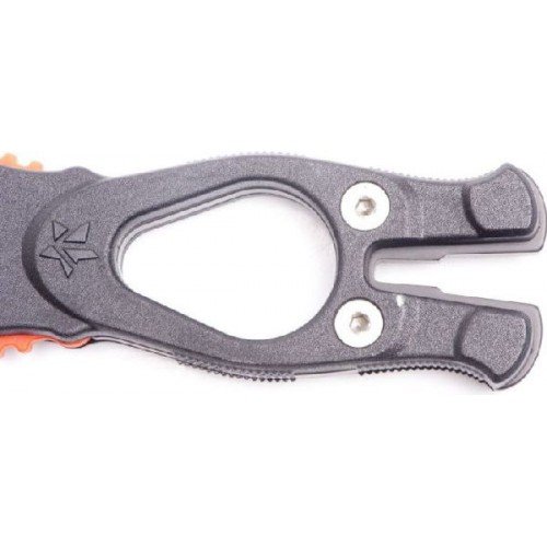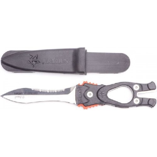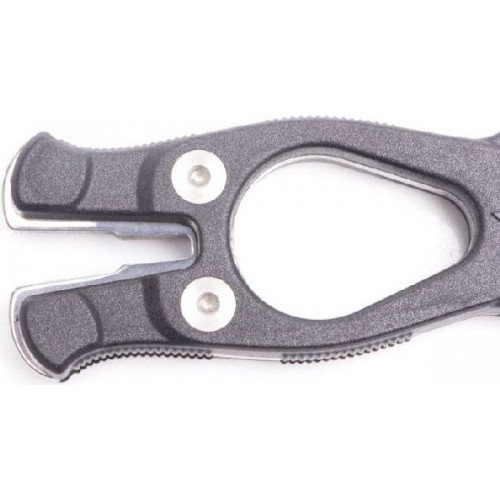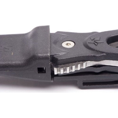 Удлиненная вогнутая линия реза, существенно облегчает разрезание одним движением различного рода шнуров, лесок, сетей - смертельную опасность для подводного охотника.