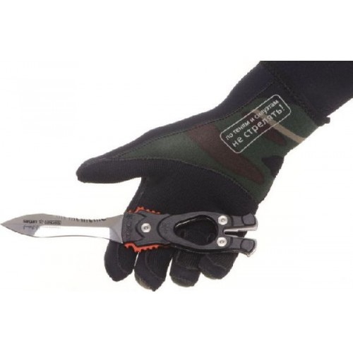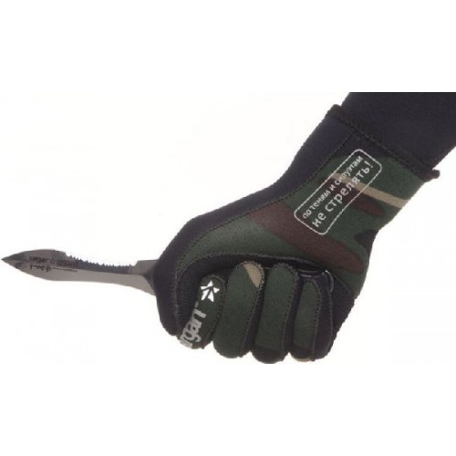 Рукоятка ножа имеет отверстие под палец, чтобы не выпускать нож из рук и "уключину" для вытаскивания застрявших гарпунов.