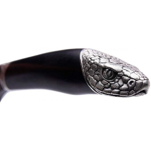 Навершие рукояти в виде змеиной головы выполнено из серебра. Деревянная часть сделана из черного дерева с резьбой, имитирующей шкуру рептилии.