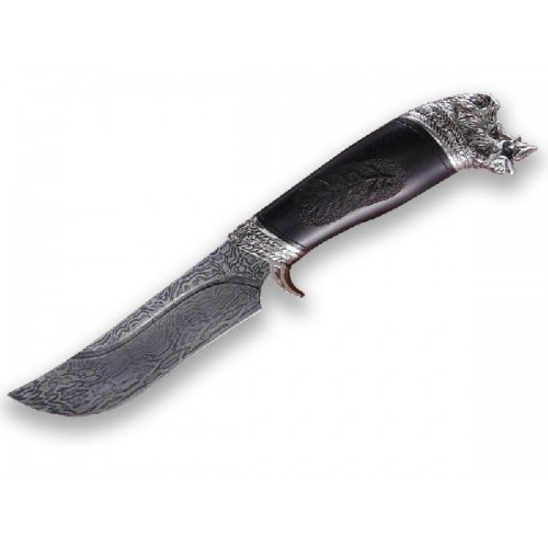 Охотничий нож «Кабан» компании Северная корона станет отличным подарком для человека, увлеченного охотой на крупного зверя. Нож тотем, нож символ, который приносит удачу. Навершие рукояти выполнено в форме головы кабана — опытного и опасного хищника. Клинок ножа изготовлен из дамасской стали, которая сочетает в себе твердость булата и мягкость углеродистой стали. Такой клинок сохраняет остроту в течение длительного времени, его легко точить и править. Рукоять из черного дерева украшена орнаментом из дубовых листьев, что символизирует смелость и отвагу.