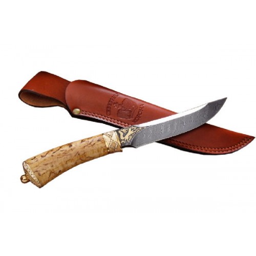 Нож комплектуется паспортом изделия, кожаным чехлом и подарочной упаковкой.