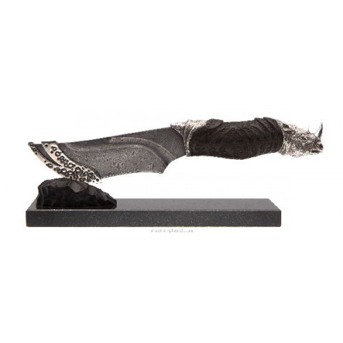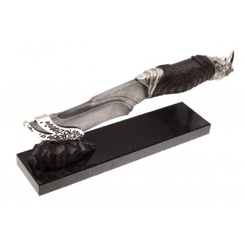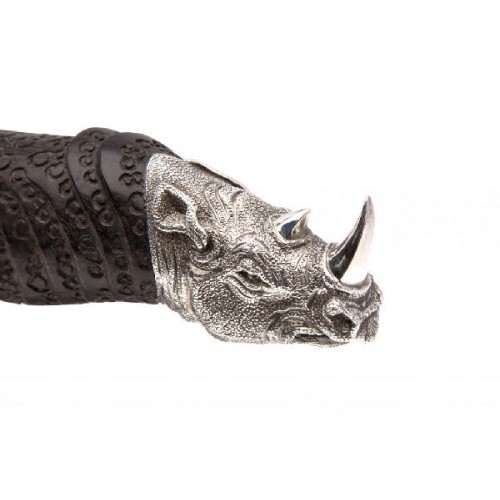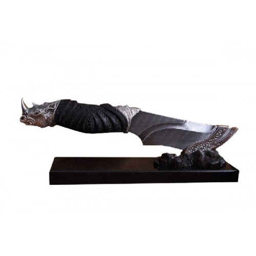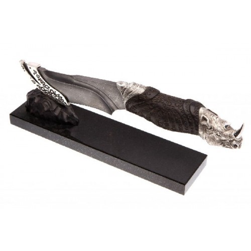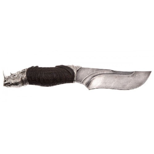 Форма клинка, характерная для скинеров, делает нож удобным при разделке дичи. Голова носорога придает ножу художественный образ и композиционно удачно вписывается в форму рукояти. Комплектуется кожаными ножнами, паспортом и подарочной упаковкой.