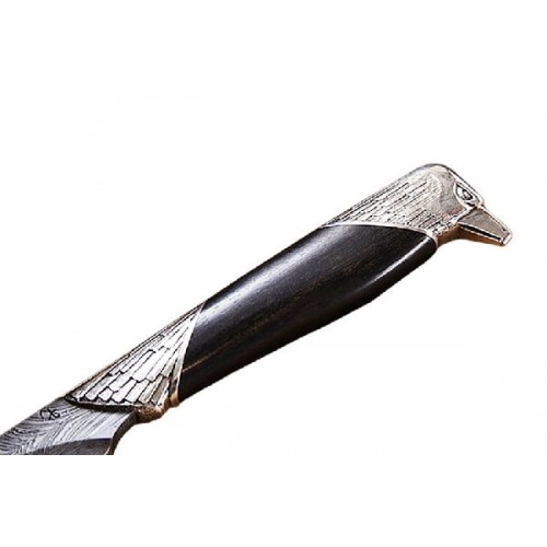 Рукоять ножа выполнена в форме орла, который сидит на скале и внимательно наблюдает за окрестностями. Нож-талисман, нож-тотем. Орел выполнен по мотивам древних индейских истуканов, которые находят при раскопках. Нож подчеркнуто строг и лаконичен. Приятный и надежный хват обеспечен благодаря рукояти из черного дерева. Голова и хвост орла покрыты серебряным напылением.