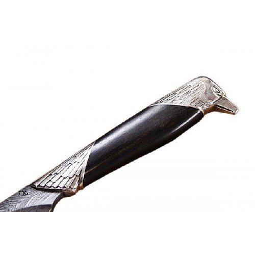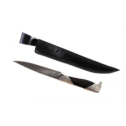 Рукоять изготовлена из черного дерева, а клинок выкован из дамаска. Нож комплектуется паспортом изделия, кожаным чехлом и подарочной упаковкой.