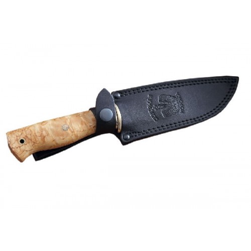 Рукоять выполняется из граба и снабжается больстером из латуни. На обеих сторонах рукояти размещена инкрустация, которая органично сочетается с натуральным орнаментом. Завершает композицию чехол ручной работы, выполненный из натуральной кожи.