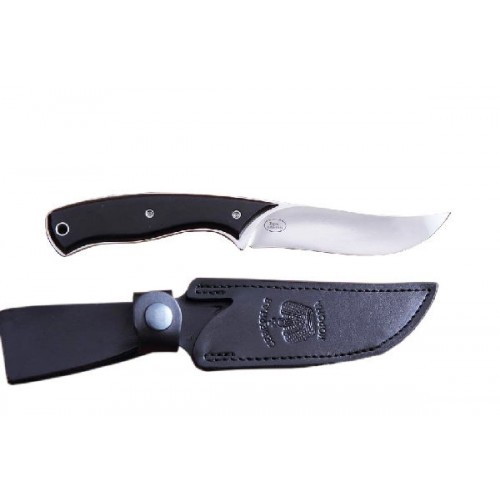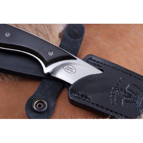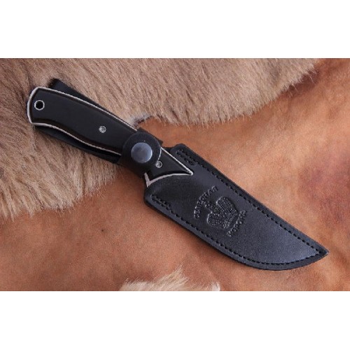 Черная рукоять из граба отлично гармонирует с кожаными ножнами черного цвета.