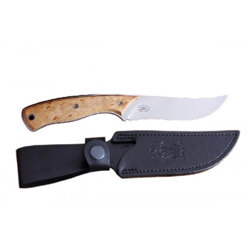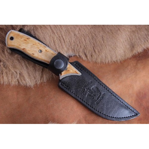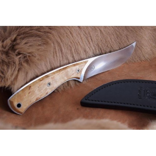 Рукоять из карельской березы отлично гармонирует с кожаными ножнами черного цвета.