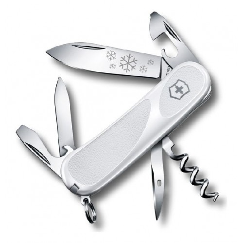 Victorinox Evolution White Christmas. Накладки ножа выполнены в белоснежном зимнем цвете, и имеют эргономичную форму как и вся линейка Victorinox Evolution. Эта специальная серия произведена ограниченным тиражом в 15 000 экземпляров. Большое лезвие украшено рисунками снежинок, нанесёнными методом травления. Нож упакован в подарочную коробку с прозрачным окном. Evolution White Christmas станет не только красивым подарком, но и самое главное полезным, удобным и функциональным инструментом, четко выполняющим свои функции.