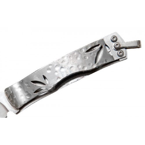 На декоративной стороне рукояти вырезаны листья бамбука, которые отсылают к названию всей серии ножей – «Take», что в переводе с японского означает «бамбук». А сама рукоять оформлена в стиле «Tsuchime». Зажим можно использовать как для купюр, так и для ношения ножа на кармане.