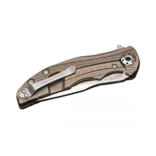 Титановая рукоять с 3D насечками имеет яркое бронзовое анодирование, как и все покрытия от ZT, оно практически не изнашивается и обладает необходимой шероховатостью для твердого удержания. Покрытие немного меняет свою яркость в зависимости от освещения и в реальности выглядит очень интересно.