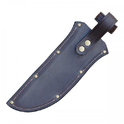 Изготовлены в традиционной форме из натуральной кожи. Оснащены специальным кожаным креплением для переноски на поясном ремне, фиксация клепкой для избежания выпадения ножа. В производстве используется итальянская фурнитура, которая практически не дает бликов. Раскрой производится на специальном оборудовании, что гарантирует высокое качество изделий. Для производства используется элитная кожа натурального сквозного прокраса. Она изготовлена по старинной технологии, не боится влаги, ружейного масла и солнечных лучей. Изделия, выполненные из этой кожи, будут служить долгие годы, сохраняя свой первозданный вид. Длина клинка 19 см.
