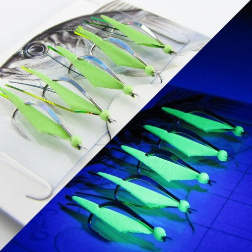 Приманка из фосфорисцирующего (светонакопительного) мобискина с усиками и обмоткой, собран на крючках серебряного цвета. Оснащен светонакопительными головками зеленого свечения.