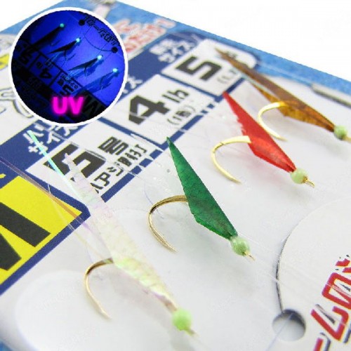 Приманка из фосфорисцирующего (светонакопительного) мобискина с усиками и обмоткой, собран на крючках золотистого цвета. Оснащен светонакопительными головками зеленого свечения.