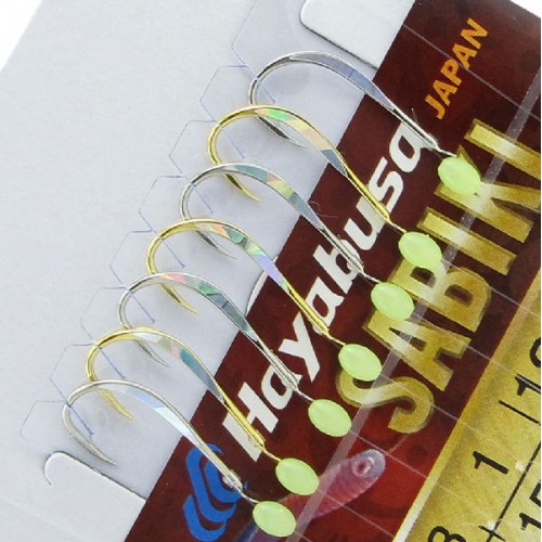 Снасть самолов (сабики) Hayabusa QR-16RB - снасть на морскую рыбу (корюшку, ставриду и т.д.) и речную стайную рыбу (волжскую селедку, чехонь, окунь и т.д.) производства Японии. Уловистая снасть для многих регионов России - Камчатка, Сахалин, побережье Черного моря, Крым, Приморский край и т.д. Крючки из высокоуглеродистой стали (один с серебрением, другой с золочением) с нанесенными голографическими чешуйками, сверхпрочная леска и светонакопительные бусинки. Количество крючков - 7 шт.