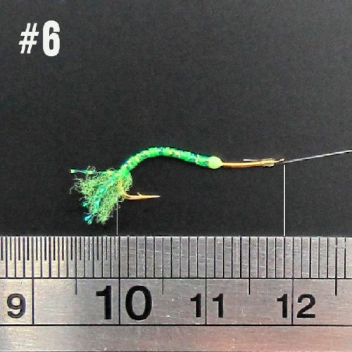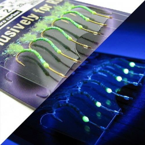 Приманка из фосфорисцирующего (светонакопительного) мобискина молочного цвета зеленого свечения с усиками и обмоткой из кристал флэш, собран на крючках золотистого цвета.