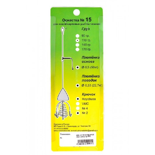 В оснастке используются крючки Hayabusa № 2. Оснастка оснащена грузом 110гр.