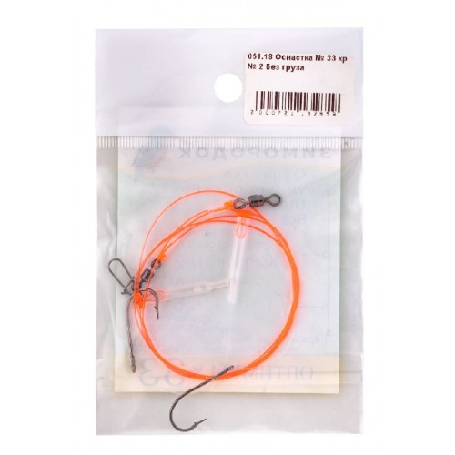 Для основы оснастки используется леска производства Японии «Оранж» Ø 0,50 (23кг). Леска уникальная — имеет небольшое растяжение (амортизацию), высокую прочность. При трении об острые предметы такие, как края раковин или камни она не режется, но остаются тонкие задиры. Прочность при этом не снижается. Крючки — Hayabusa Baitholder № 2 (леска на поводки Ø 0,28 (8кг)), № 4 (леска на поводки Ø 0,25 (7кг)), № 6 (леска на поводки Ø 0,25 (7кг)).