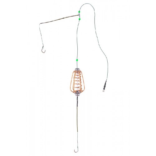 Кормушка оснащается прикормом. Насадка для нижнего поводка - кукуруза, червь или тесто. Насадка для отводного поводка - кукуруза или червь.