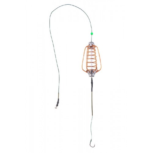 Кормушка заполняется прикормкой и уплотняется вручную. Поводок имеет жесткую термоусадочную оболочку, что защищает его от повреждений об острые створки перловицы и дресены, а также препятствует запутыванию.