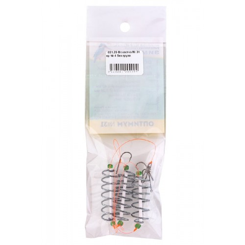 В оснастке 3 кормушки и 3 крючка. Производится с крючком № 4. Основная леска Ø 0,50мм (до 23кг) оранжевая с эффектом амортизации. Поводок Ø 0,25мм (7кг).