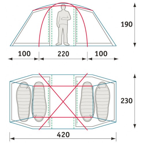 Просторная кемпинговая четырёхместная палатка удобно разделена на две комнаты, каждая со своим входом. На стенках палатки не образуется конденсат, она хорошо сохраняет тепло и при этом отлично вентилируется. Палатка сохранит ваш уют и комфорт даже в дождливую погоду. От ветра вас защитит специальный полог, а благодаря проклеенным швам внутрь не проникает влага. Конструкция палатки включает в себя большой тамбур, в котором можно разместить все вещи и экипировку, навес, внутренние карманы, петли для фонарика. С кемпинговой палаткой ALEXIKA FLORIDA 4 вы прекрасно проведёте время на природе не только летом, но и в осенне-весенний сезон.