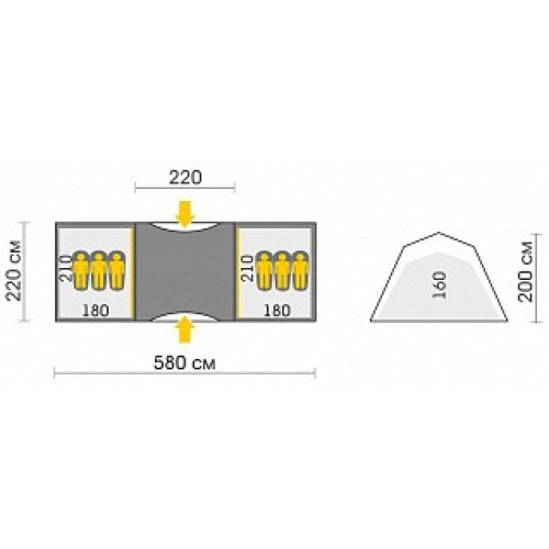 Общие габариты дома-палатки 6 составляют 580x220x200 см.