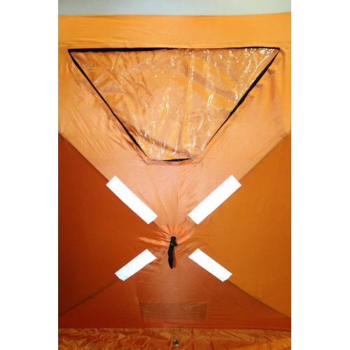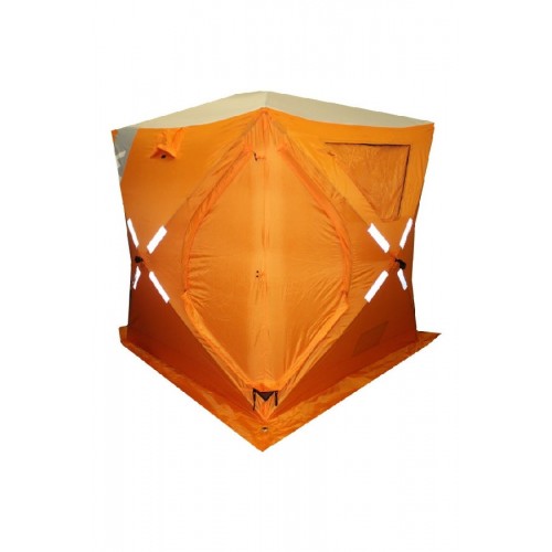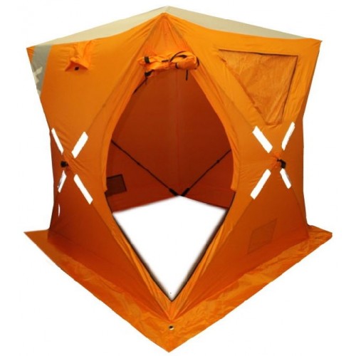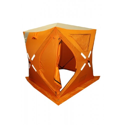 Прочный каркас из стекловолокна (фибергласс) обеспечивает надежное сохранение кубической формы в сильный ветер и препятствует накоплению влаги и снега на крыше палатки. Прочный, водостойкий и термо сберегающий материал тента, с широкой по всему периметру снегозащитной юбкой, обеспечивает полную защиту от ветра, снега и дождя.