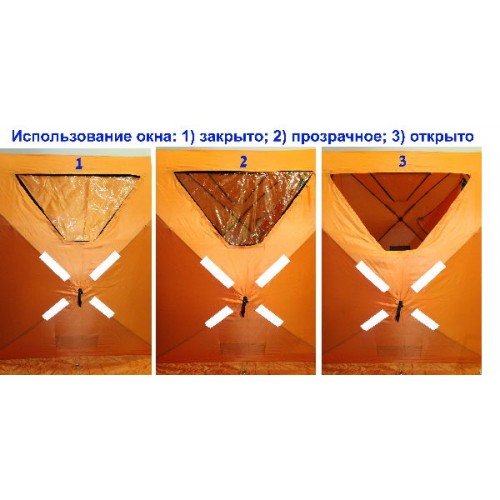 - Два больших прозрачных окна, материалTRP морозостойкий обеспечивают достаточное освещение внутри нее даже в пасмурный зимний день и позволяют комфортно наблюдать за всем происходящим снаружи. Прозрачные окна при необходимости можно снять или полностью закрыть в зависимости от условий ловли. В настоящее время такую высокую естественную освещенность внутри не имеет ни одна аналогичная палатка.